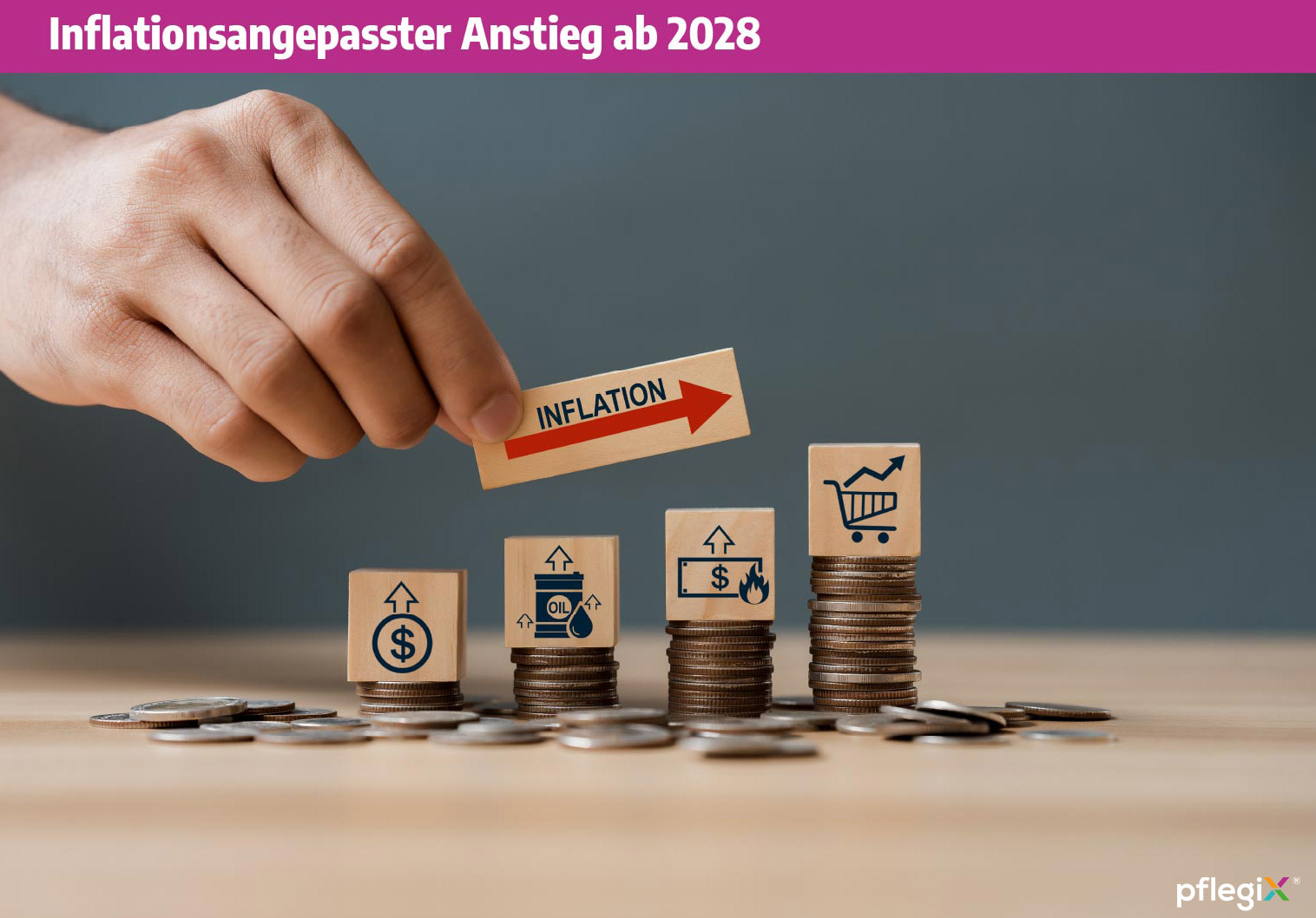 Ein nächster Erhöhungsschritt für sämtliche Leistungen der Pflegeversicherung ist für 2028 geplant. Hier steht die genaue Größenordnung noch nicht fest, denn die weitere Entwicklung der Preise soll Berücksichtigung finden. Dafür wird die kumulierte Kerninflationsrate der drei vorausgegangenen Kalenderjahre zugrunde gelegt. Der Anstieg darf jedoch nicht stärker ausfallen als die Bruttoeinkommen der Arbeitnehmer im selben Zeitraum.